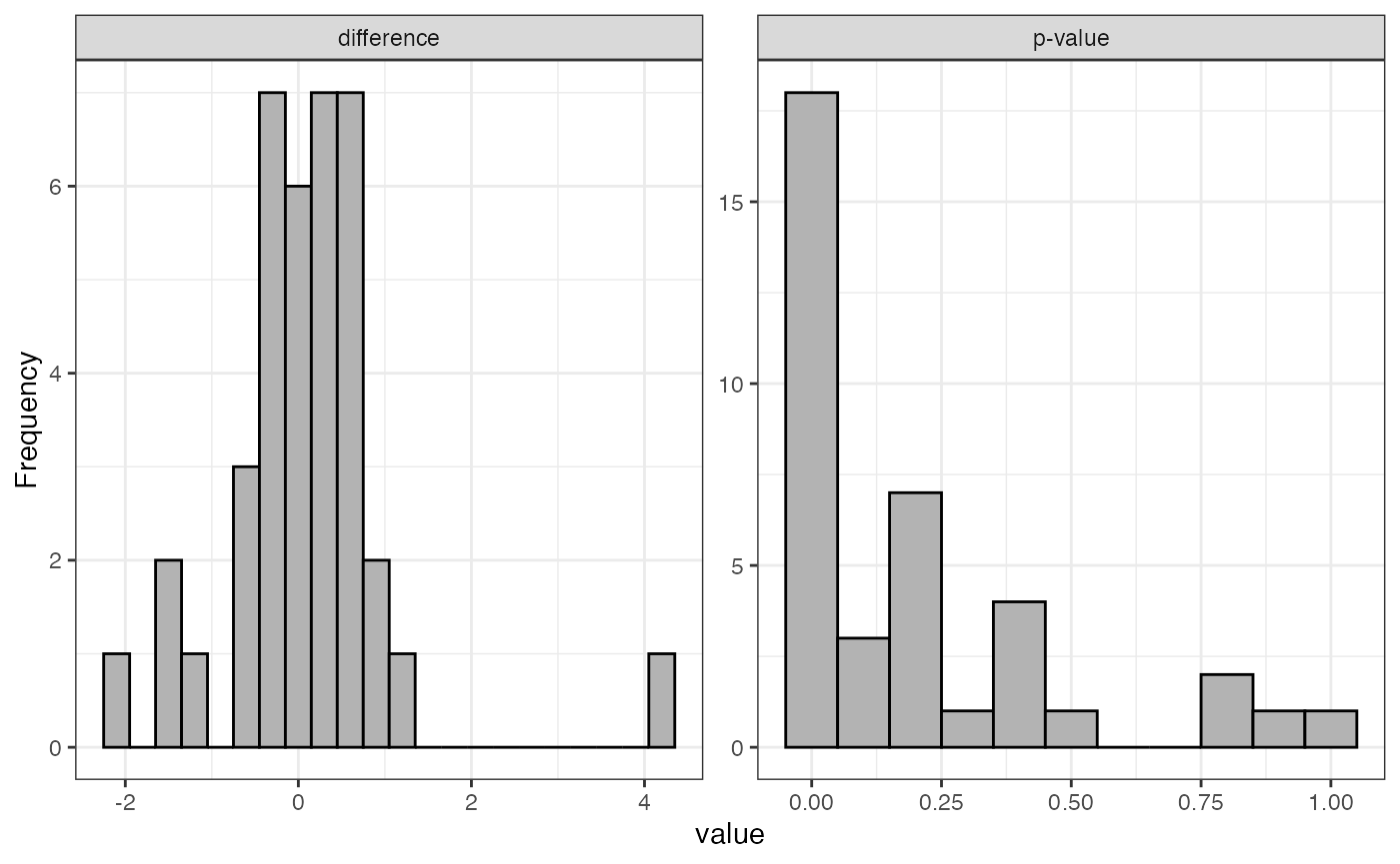 p-values, most p-values are expected to be non-significant (above 0.05).