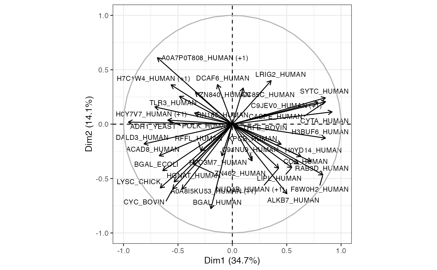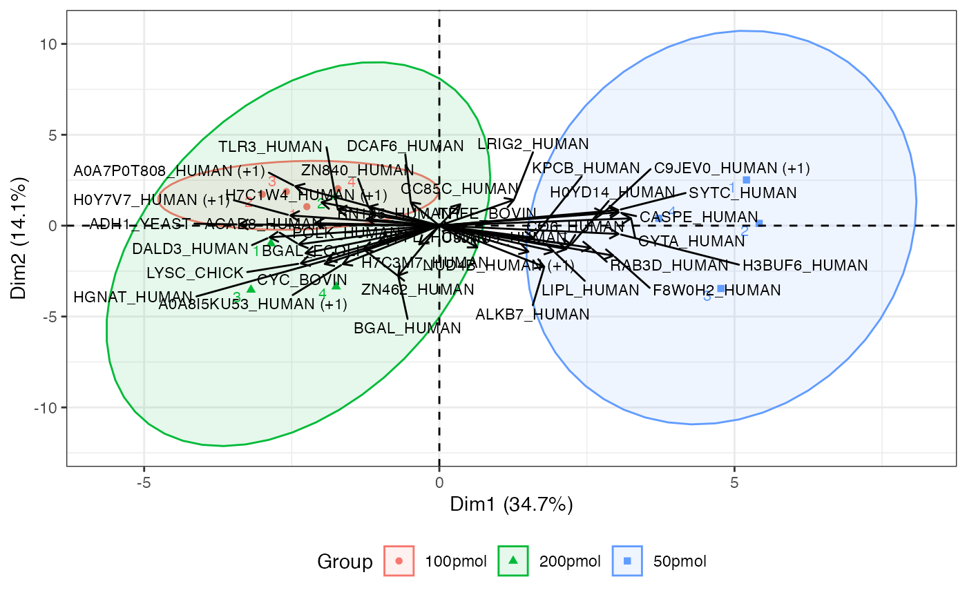The biplot includes individual and variable plots. Again, with a large number of proteins, this plot can be unwieldy.